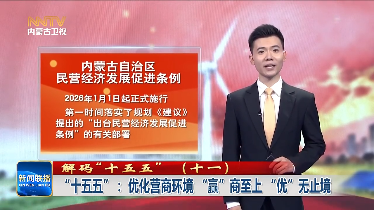 《內(nèi)蒙古自治區(qū)黨委關(guān)于制定國(guó)民經(jīng)濟(jì)和社會(huì)發(fā)展第十五個(gè)五年規(guī)劃的建議》,對(duì)未來五年內(nèi)蒙古發(fā)展作出頂層設(shè)計(jì)和戰(zhàn)略擘畫,是乘勢(shì)而上、接續(xù)推進(jìn)中國(guó)式現(xiàn)代化內(nèi)蒙古新篇章的總部署?!秲?nèi)蒙古新聞聯(lián)播》特別策劃《解碼“十五五”》今天播出第十一期《“十五五”:優(yōu)化營(yíng)商環(huán)境 “贏”商至上 “優(yōu)”無止境》。