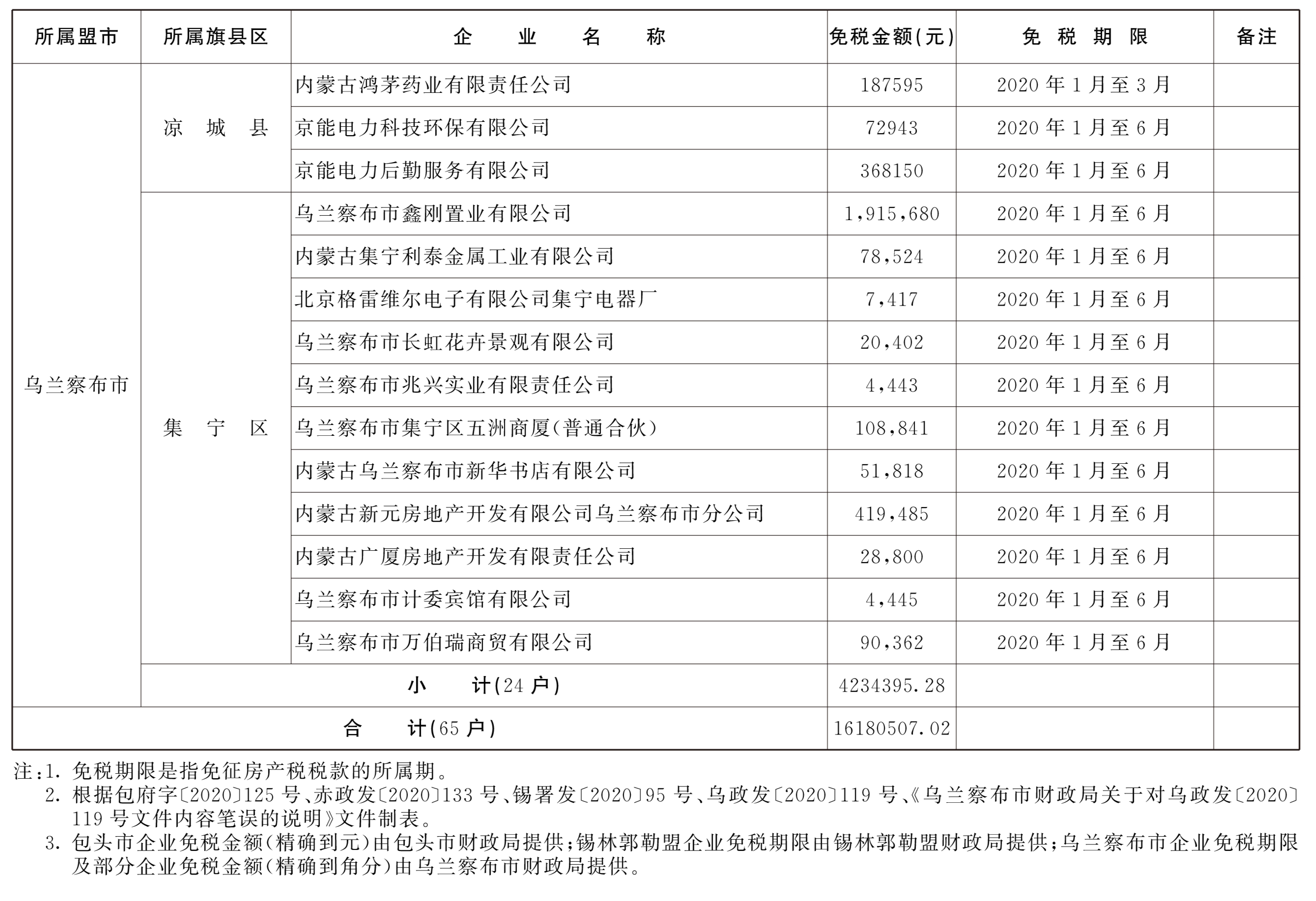 一、同意免征包頭市、赤峰市、錫林郭勒盟、烏蘭察布市65戶受新冠肺炎疫情影響企業(yè)應(yīng)納房產(chǎn)稅合計(jì)16180507.02元。其中,包頭市15戶,免稅3328837.9元;赤峰市23戶,免稅8597205.82元;錫林郭勒盟3戶,免稅20068.02元;烏蘭察布市24戶,免稅4234395.28元。具體免稅企業(yè)名稱、免稅金額和免稅期限見附件。
