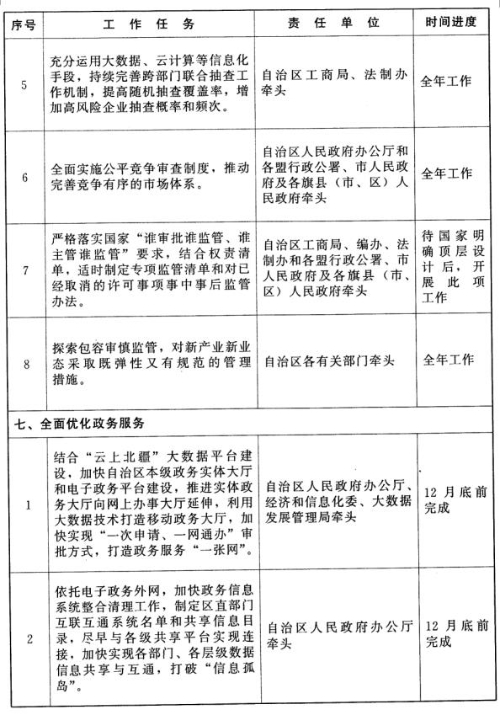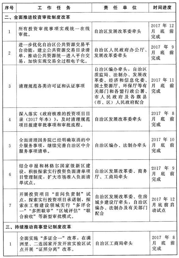 1.加快“多證合一”改革。繼續(xù)鞏固和擴(kuò)大“五證合一”“兩證整合”改革成果,全面實施“多證合一”改革,在滿洲里、二連浩特國家開發(fā)開放實驗區(qū)試點開展“證照分離”改革,積累可復(fù)制可推廣經(jīng)驗。(自治區(qū)工商局牽頭,自治區(qū)各有關(guān)部門和各盟行政公署、市人民政府及各旗縣(市、區(qū))人民政府按職責(zé)分工負(fù)責(zé))