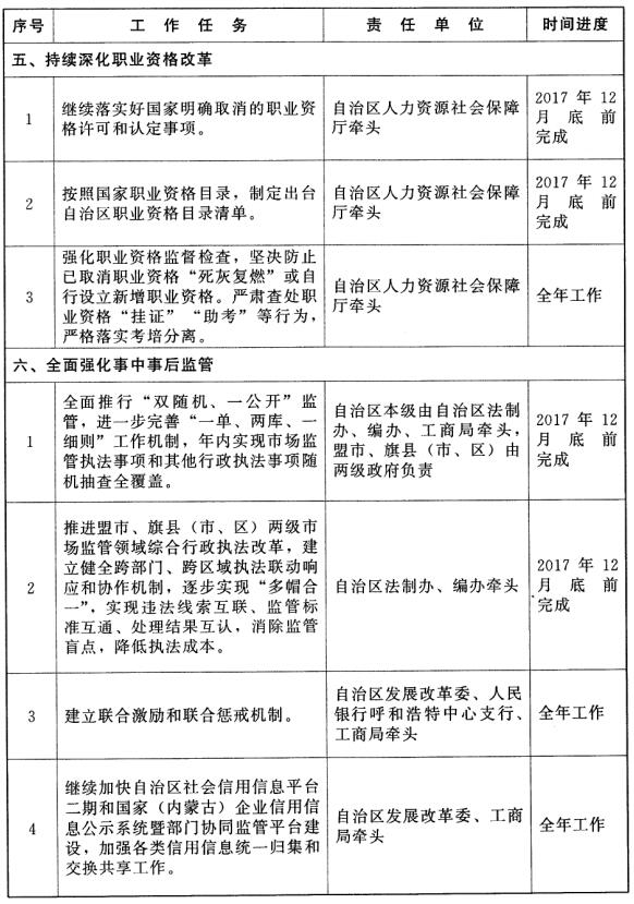 1.全面落實取消職業(yè)資格事項。繼續(xù)落實好國家明確取消的職業(yè)資格許可和認(rèn)定事項。(自治區(qū)人力資源社會保障廳牽頭,自治區(qū)各有關(guān)部門和各盟行政公署、市人民政府及各旗縣(市、區(qū))人民政府按職責(zé)分工負(fù)責(zé))