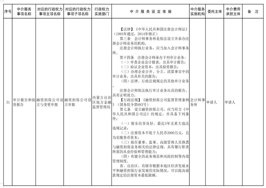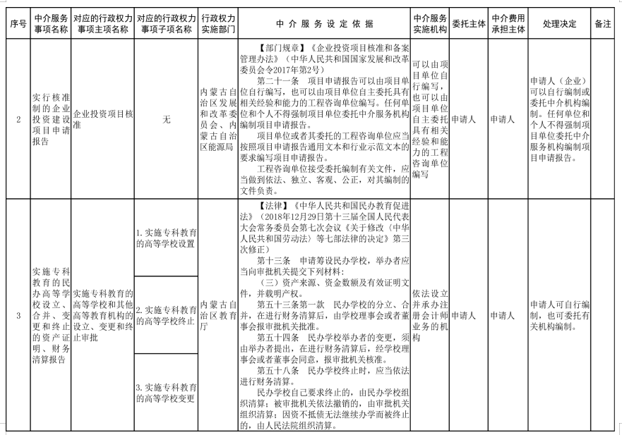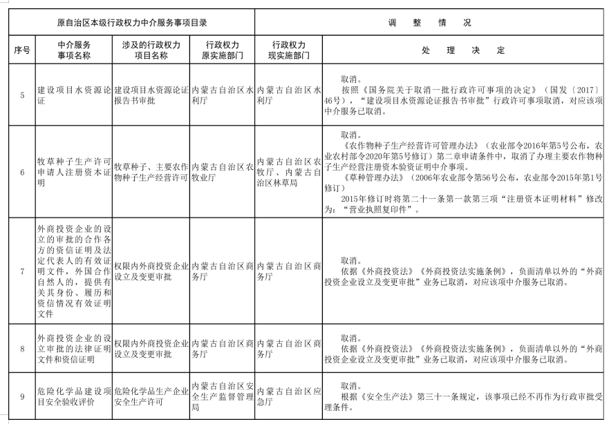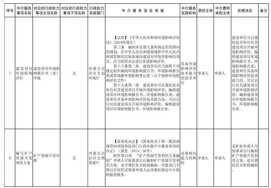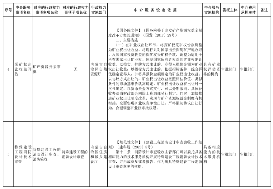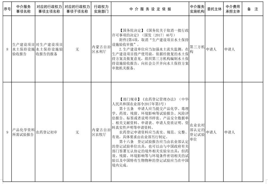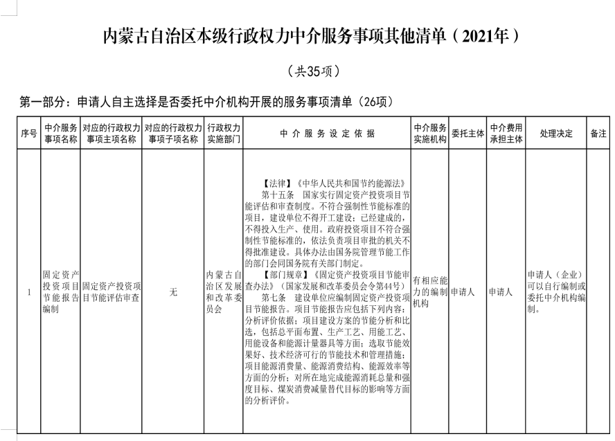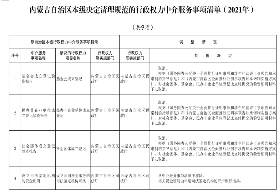為規(guī)范行政權(quán)力中介服務(wù)行為,促進(jìn)中介服務(wù)市場健康發(fā)展,按照《優(yōu)化營商環(huán)境條例》(國務(wù)院令第722號)、《國務(wù)院辦公廳關(guān)于清理規(guī)范國務(wù)院部門行政審批中介服務(wù)的通知》(國辦發(fā)〔2015〕31號)、《國務(wù)院關(guān)于第三批清理規(guī)范國務(wù)院部門行政審批中介服務(wù)事項(xiàng)的決定》(國發(fā)〔2017〕8號)等法規(guī)文件精神及自治區(qū)黨委和政府相關(guān)工作要求,經(jīng)對自治區(qū)本級各部門開展行政審批、備案等工作中涉及的中介服務(wù)事項(xiàng)進(jìn)行清理和規(guī)范,現(xiàn)將《內(nèi)蒙古自治區(qū)本級保留由申請人付費(fèi)委托行政權(quán)力中介服務(wù)事項(xiàng)清單(2021年)》《內(nèi)蒙古自治區(qū)本級行政權(quán)力中介服務(wù)事項(xiàng)其他清單(2021年)》(第一部分申請人自主選擇是否委托中介機(jī)構(gòu)開展的服務(wù)事項(xiàng)清單和第二部分審批部門付費(fèi)委托中介機(jī)構(gòu)開展的服務(wù)事項(xiàng)清單)、《內(nèi)蒙古自治區(qū)本級決定清理規(guī)范的行政權(quán)力中介服務(wù)事項(xiàng)清單(2021年)》印發(fā)給你們,并提出以下意見,請一并貫徹落實(shí)。