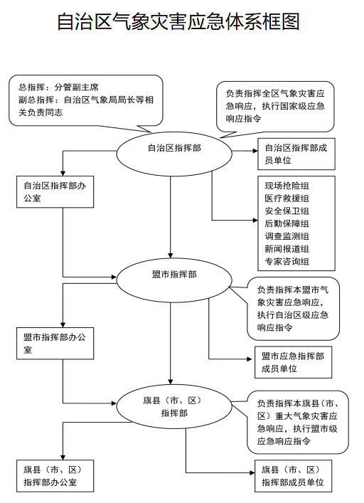 自治區(qū)人民政府成立自治區(qū)人工影響天氣與氣象災(zāi)害防御指揮部(以下簡(jiǎn)稱(chēng)“自治區(qū)指揮部”),統(tǒng)一領(lǐng)導(dǎo)和指揮氣象災(zāi)害監(jiān)測(cè)、預(yù)報(bào)預(yù)警、分析研判和應(yīng)急處置工作。總指揮由自治區(qū)政府分管副主席擔(dān)任,內(nèi)蒙古氣象局局長(zhǎng)等相關(guān)負(fù)責(zé)同志擔(dān)任副總指揮。