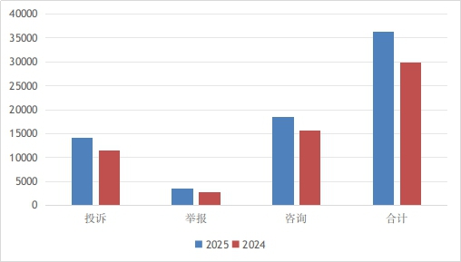 2025年4月份,內蒙古全國12315平臺共接收消費者投訴、舉報、咨詢36235件,同比增長21.30%,環(huán)比增長0.74%。其中,投訴14147件,占總量的39.04%;舉報3553件,占總量的9.81%;咨詢18535件,占總量的51.15%。