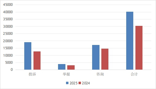 2025年10月份,內(nèi)蒙古全國12315平臺(tái)共接收消費(fèi)者投訴、舉報(bào)、咨詢40280件,同比增長32.08%。其中,投訴19120件,占總量的47.47%;舉報(bào)3938件,占總量的9.78%;咨詢17222件,占總量的42.75%。